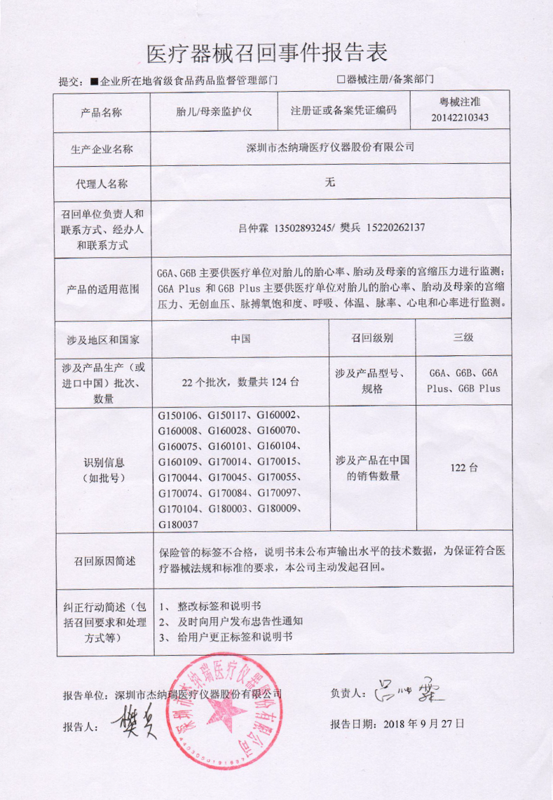 深圳市杰纳瑞医疗仪器股份有限公司报告,该公司生产的胎儿/母亲监护仪经检验,不符合标准规定。深圳市杰纳瑞医疗仪器股份有限公司主动召回有关产品,召回级别为三级。涉及产品的型号、规格及批次等详细信息见《医疗器械召回事件报告表》。